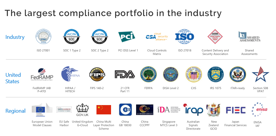 Azure has been recognized as the most trusted cloud for U.S government institutions, which also includes a FedRAMP High authorization covering 18 Azure services. It offers the most comprehensive compliance coverage with over 50 compliance offerings.